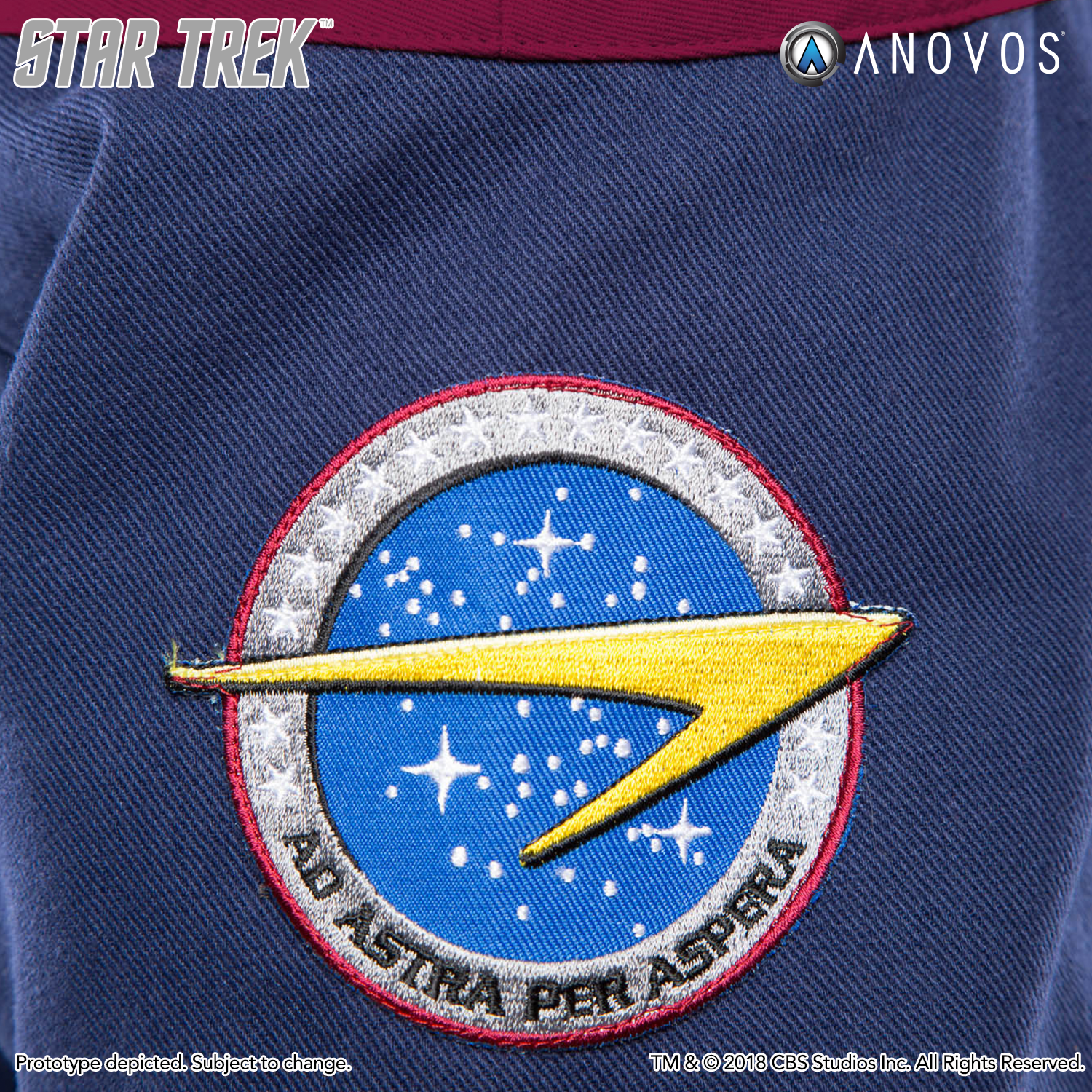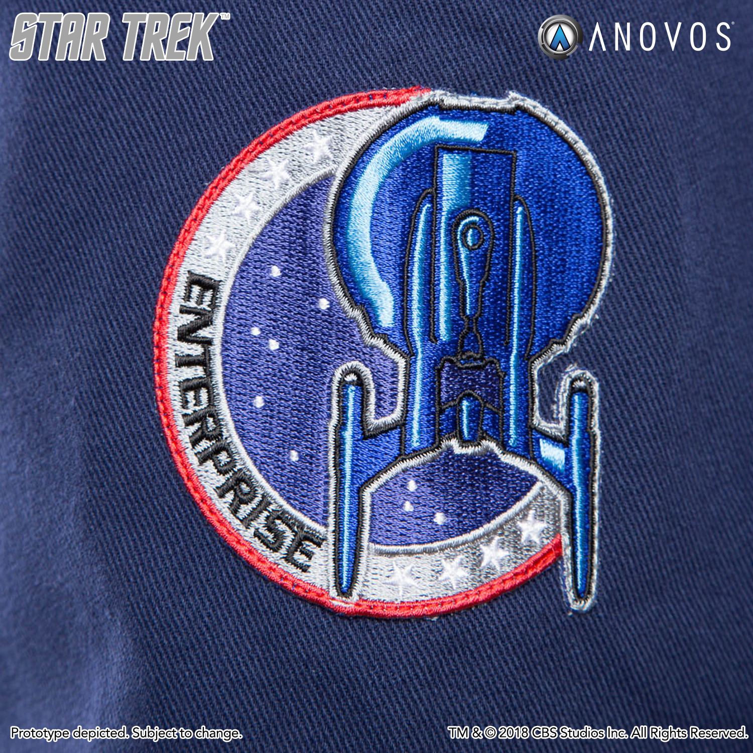 Features patches from artwork created by Mike Okuda, as well as command division burgundy striping and unique neck mirroring the look of the Enterprise jumpsuit!