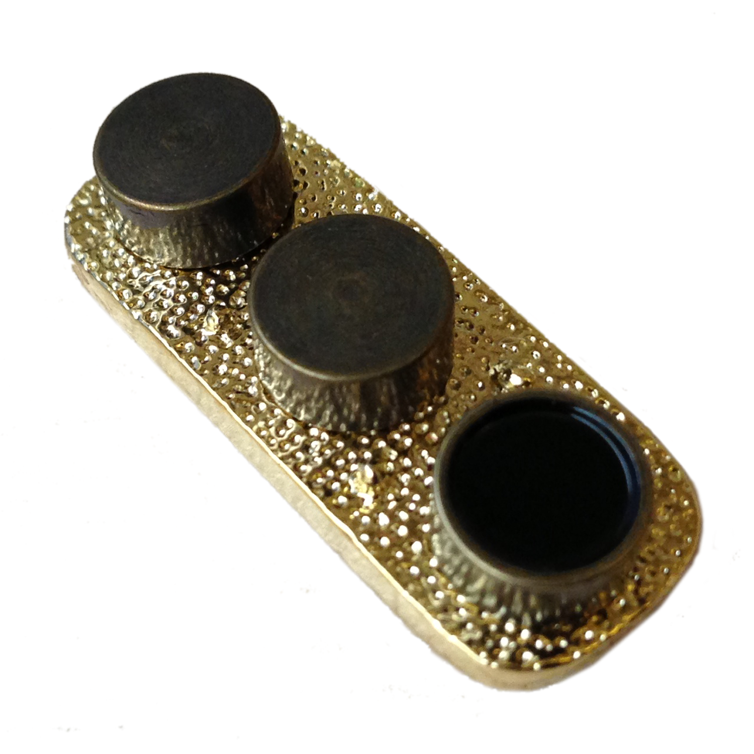 Replicated from screen-used and production-made rank devices, these hand-made and hand-assembled rank uniform jewelry devices ("pips") are fully metal, using rare-Earth magnets in both the individual pip and backing device. Each pip is distinctively weathered, replicating the look first introduced in Star Trek™: The Next Generation. With this offering, the mainstay uniform devices of the 24th century have been brought into the 21st.