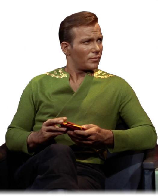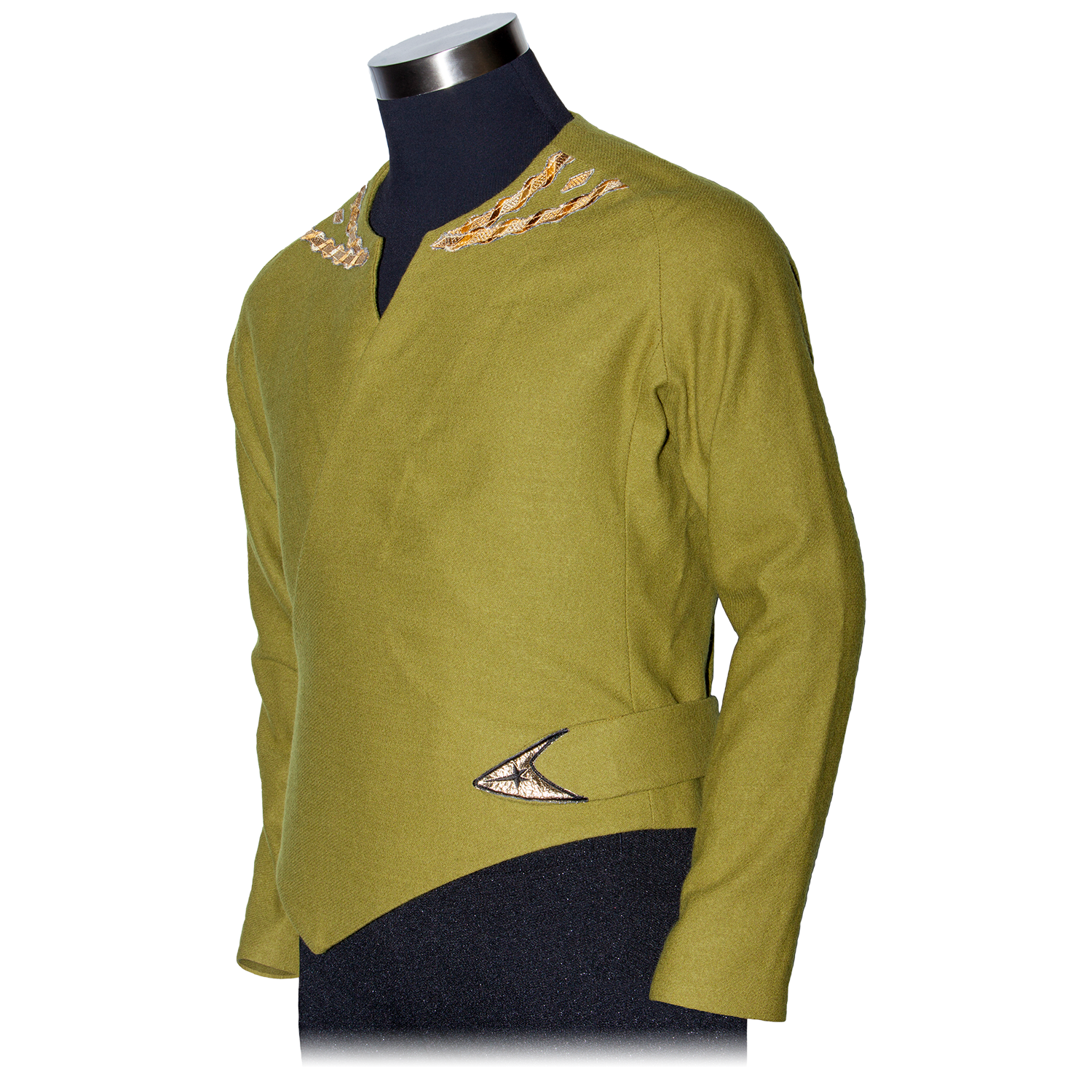 The green wraparound tunic Captain Kirk wears during the first season of Star Trek™: The Original Series is an optional tunic Starship captains are permitted to wear while on duty. This is the first of two wrap-around tunic styles Captain Kirk wore during the original five year mission. The uniform displays his rank braid around the collar, and fastens using his Starfleet command division insignia.