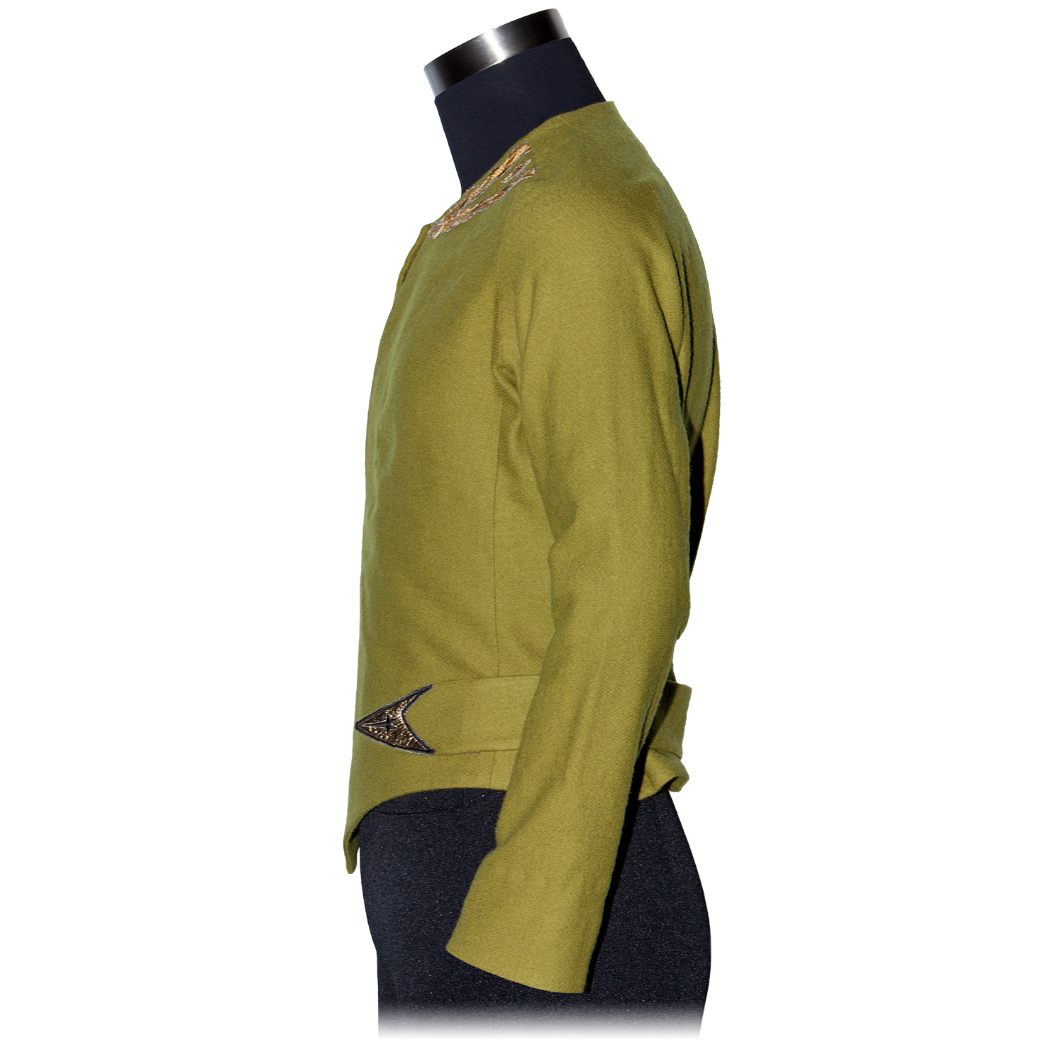 This tunic uses custom-milled and dyed wool fabric and features first season “reverse helix” captain's rank braid on the shoulders, and the Starfleet Insignia on the wraparound hook and loop fastener.